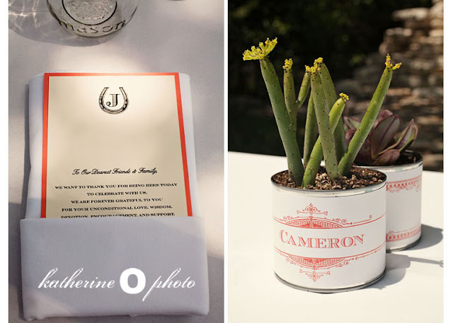 "Our centerpieces were a wonderful collaboration of family and friends. My mother and our dear friend Ann gathered all the succulents and potted them the day before the wedding in little terra cotta pots. They arranged them on the tables with Mexican tiles that had been brought to us from Mexico from my sister-in-law, Kelly. For the table names I used scans from a book from the 1940s that I found in a thrift store years ago called "What kinda cactus izzat?". I had used cactus on our invitations so I loved being able to incorporate the cactus motif but in a more humorous way.